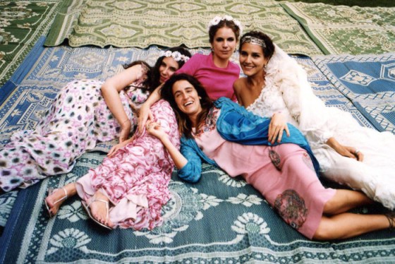 Margherita accessorized her bridal gown simply with an unadorned silver tiara, a long veil and adorable flat gladiator sandals, while her bridesmaids wore variations of long, flowy dresses or gypsy-style skirts with floral prints, crop tops and headdresses made of daisies.