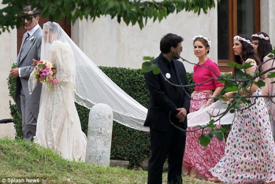 Later in the evening, the newly minted Mrs. Missoni-Amos changed into a blush pink version of her wedding dress for the reception and switched out her silver tiara for a flowery headpiece.