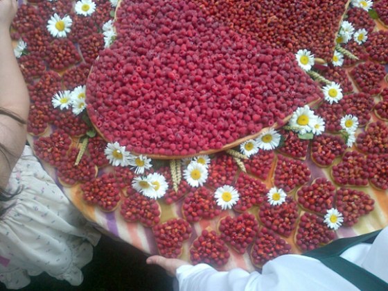 The wedding cake was shaped in the form of a huge heart and topped with hundreds of wild berries.